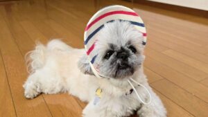 陽射しの強いこの時期は、白内障予防・短頭種の子達は草などから目を守るためにも帽子に馴らしておくと安心ですね♪