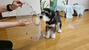去勢手術も控えているため、エリザベスカラーの練習も行いました。