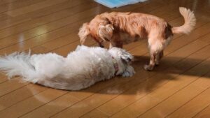 寝ているぽんちゃんに、ちょっとかいを出すジェニファーちゃんと、気にしない ぽんちゃん🤣