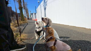 マルちゃんとジェニファーちゃんは、大通りが苦手なので丁寧に社会化しながら歩きました。
