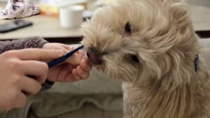 お店の外でトリマーさんからご褒美をもらうと