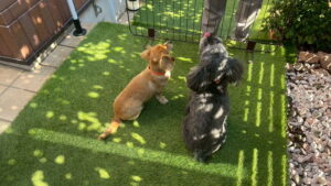 犬が苦手な菜那ちゃんも、落ち着いたジェニファーちゃんとは安心してフリーで過ごせるようです😊